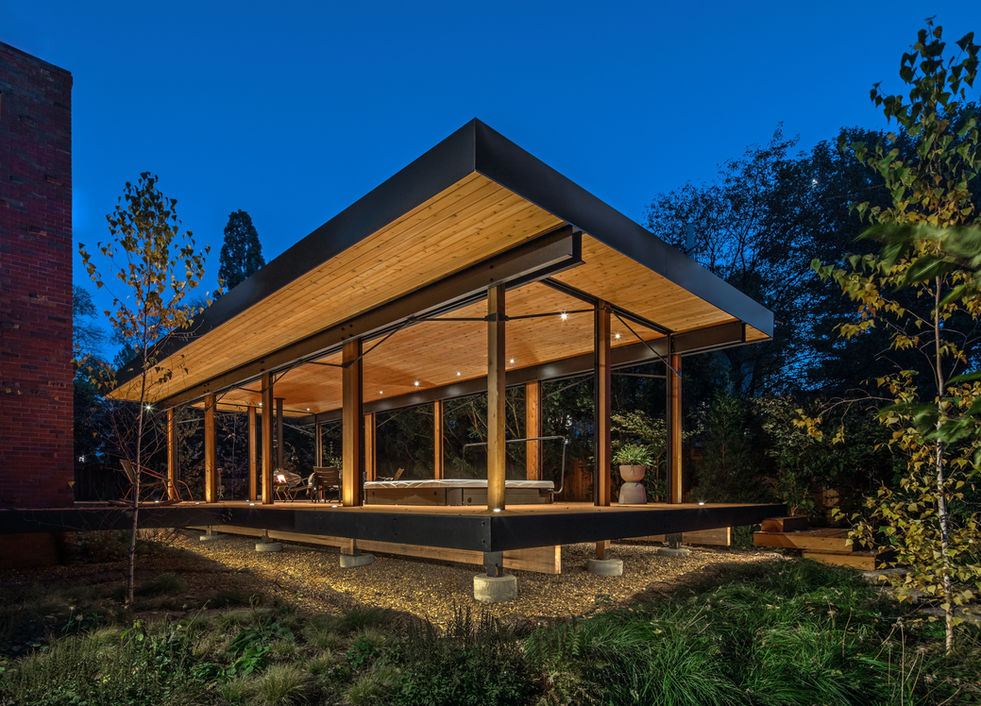 This outdoor pavilion was envisioned as a retreat for wellness, calm and relaxation. The owners sought a space to unwind- with a hot tub, cold plunge and sauna integrated into a tranquil garden setting.